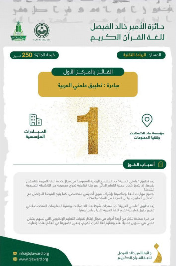 الحصول على المركز الأول في الريادة التقنية ضمن مسابقة الأمير خالد الفيصل للغة القرآن الكريم.